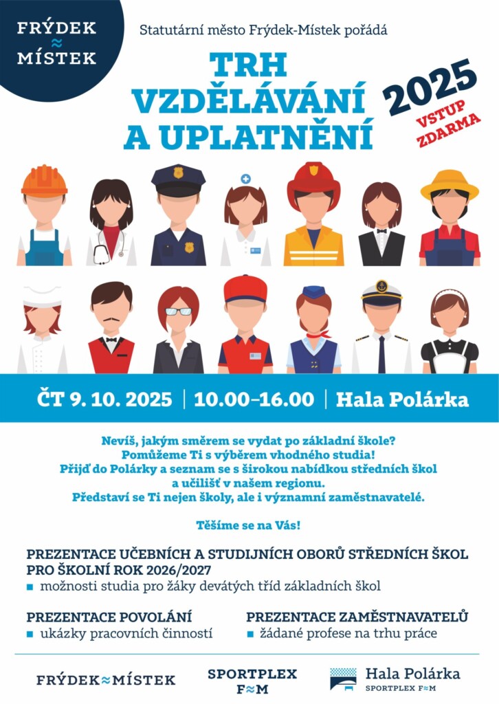 Město Frýdek-Místek pořádá ve čtvrtek 9. října 2025 tradiční Trh vzdělávání a uplatnění. Uskuteční se v hale Polárka od 10 do 16 hodin.