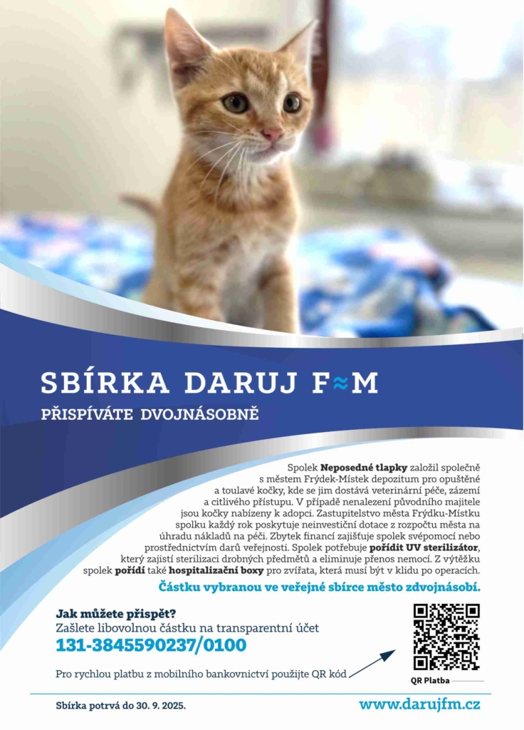 Sbírkový program frýdecko-místecké radnice DARUJ F≈M má dva nové účely. Dárci mohou zaslat příspěvky spolku Cesta bez bariér nebo spolku Neposedné tlapky, který provozuje kočičí depozit. Město finální vybrané částky zdvojnásobí.