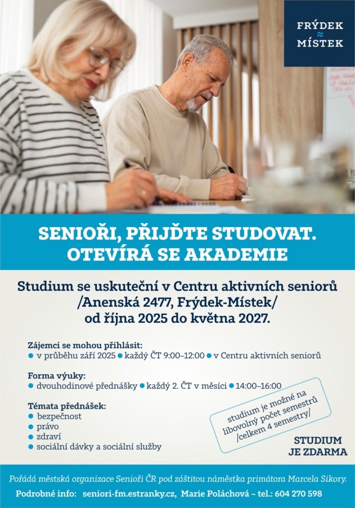 Senioři z Frýdku-Místku se mohou na podzim začít vzdělávat v nové akademii. Studium se uskuteční v Centru aktivních seniorů od října 2025 do května 2027.