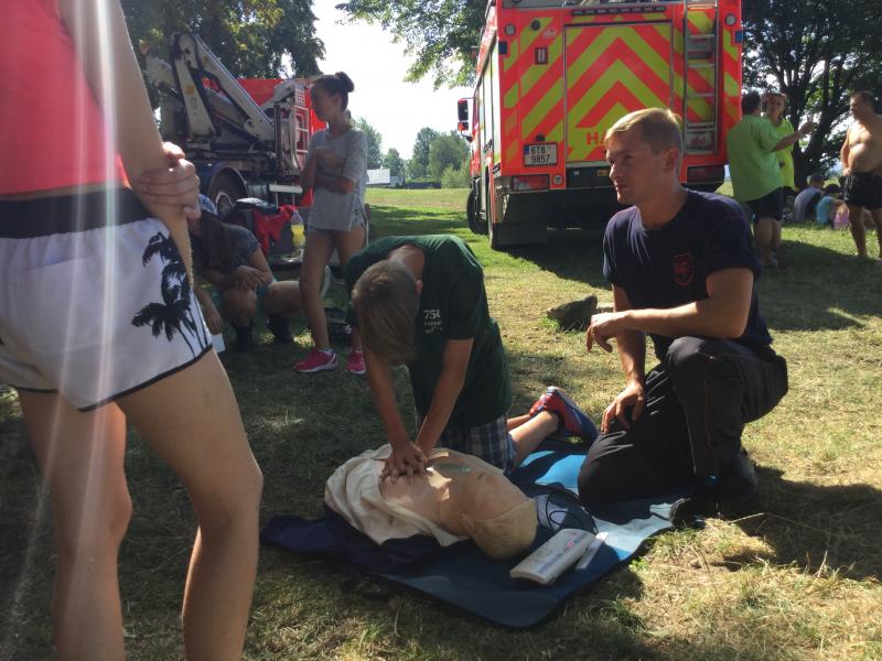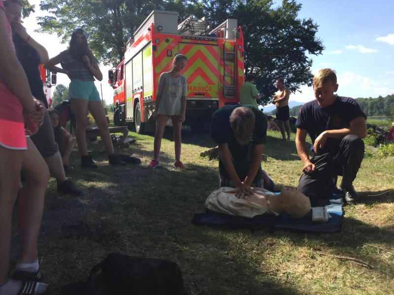 Je čtvrtek 3. 8., mladí hasiči jsou ve Frýdku-Místku šestý den. Po snídani nasedli do autobusů a vyrazili na Žermanickou přehradu za ukázkou práce na vodě týmem WASAR a ke koupání.