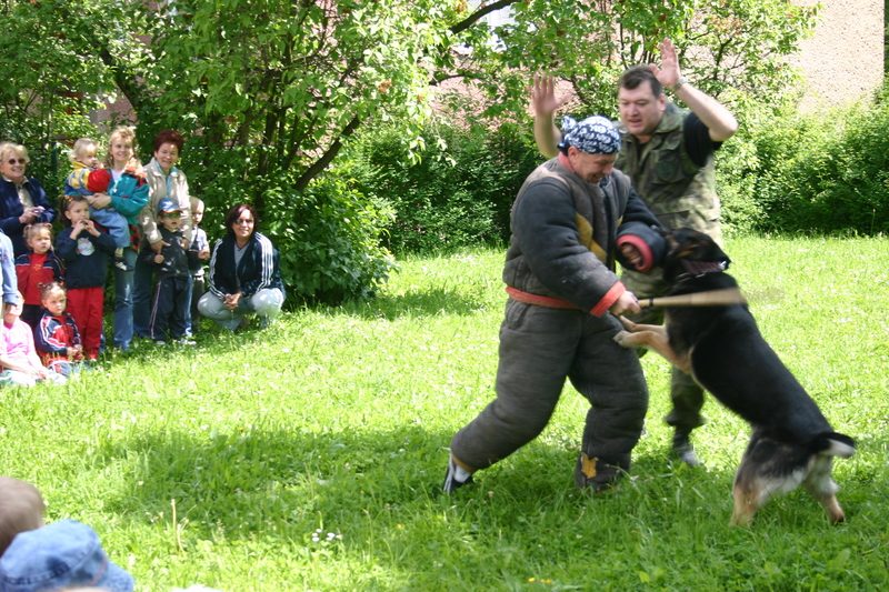 Více než cokoliv jiného je však zajímal devítiletý německý ovčák Ben, který už je dnes mimo službu. „S havířovskou městskou policií je velmi dobrá spolupráce. Při přednáškách pro školy obzvlášť, protože naše městská policie vlastní kynologický oddíl nemá,“ vysvětluje Tomáš Zapletal. Havířovští strážníci Luboš Cabák a Jan Beneš připravili se psem krátkou přehlídku základních dovedností, poté předvedli i klasický zákrok na pachatele a bránění. Při dramatickém výskoku psa na figuranta se mezi dětmi nesl nadšený výskot. „Přehlídka měla u dětí nevídaný úspěch. Bylo to vtipné, poutavé a poučné. Děti byly maximálně nadšené,“ pochvalovala si program učitelka z mateřské školy Jana Šebestová, která co chvíli z policejního auta vytahovala děti jako králíky z klobouku.