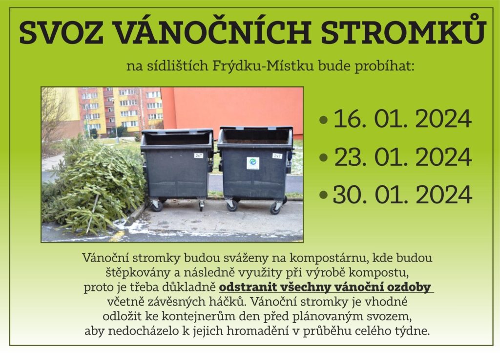 Svoz vánočních stromků od kontejnerů na komunální odpad bude ve statutárním městě Frýdku-Místku (sídlištní zástavbě) bude probíhat v úterý 16.01.2024, 23.01.2024 a 30.01.2024.