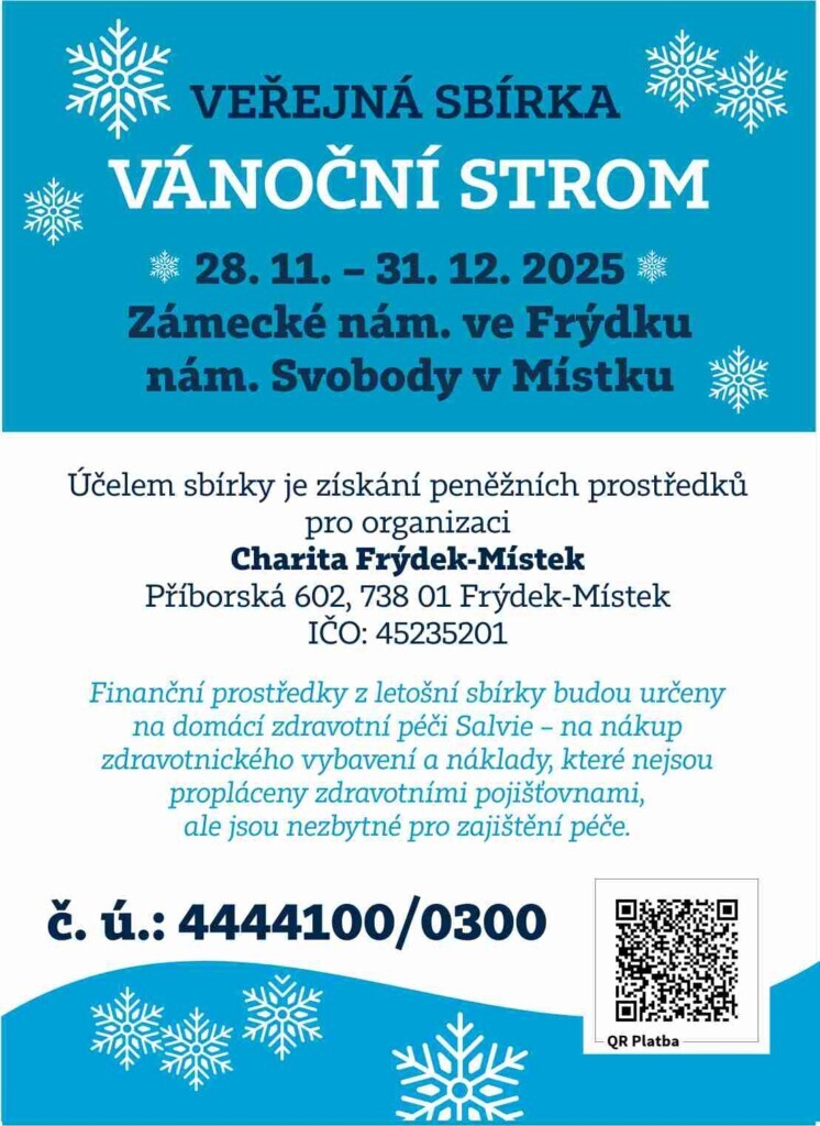 Tradiční frýdecko-místecká adventní sbírka Vánoční strom se přehoupla do své druhé poloviny. Letos mohou lidé až do konce roku přispívat na podporu domácí zdravotní péče Salvia. Nově prostřednictvím ne jedné, ale rovnou dvou zabezpečených pokladniček, které najdou pod vánočními stromy v Místku a na Zámeckém náměstí. Třetí možností je vklad na účet 4444100/0300.