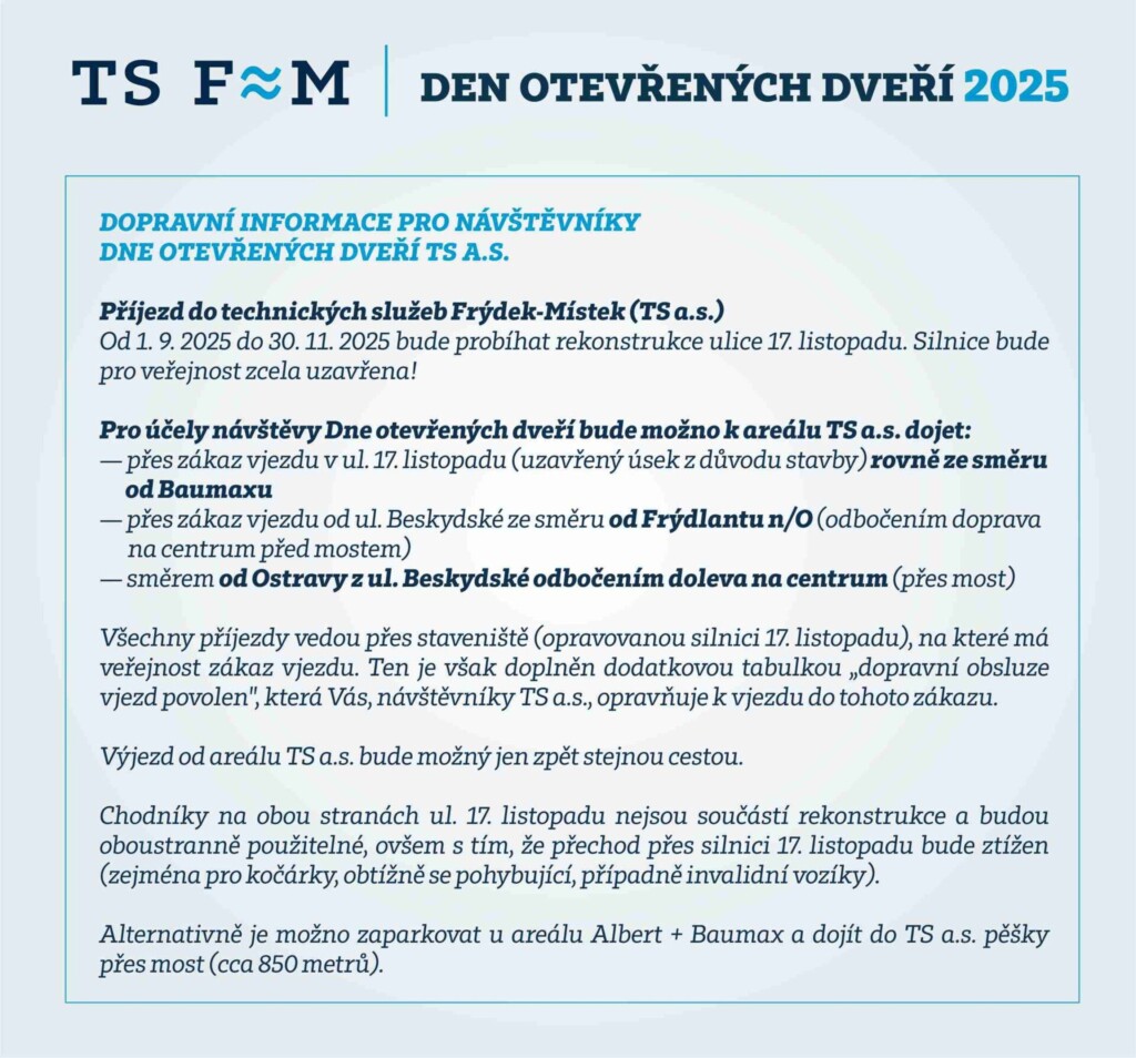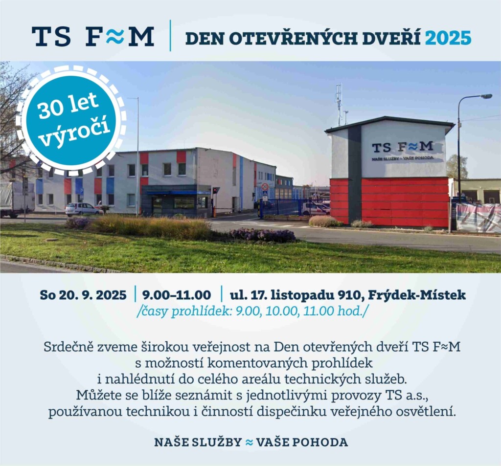 Technické služby Frýdek-Místek zpřístupní své sídlo veřejnosti. Prohlídky areálu v ulici 17. listopadu se uskuteční v sobotu 20. září 2025 mezi 9. a 11. hodinou. Souběžně si TS a. s. letos připomínají výročí. Novodobé technické služby působí ve Frýdku-Místku již 30 let, od 1. 9. 1995. Nyní jsou jedněmi z největších technických služeb v České republice.