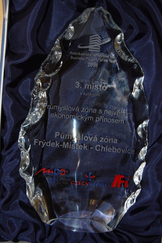 Náměstek primátora Michal Pobucký s oceněním, které si vysloužila Průmyslová zóna Frýdek-Místek- Chlebovice. Agentura pro podporu podnikání a investic Czechinvest, podřízená Ministerstvu průmyslu a obchodu ČR, spolu s partnery projektu udělily Frýdku-Místku 3. místo v soutěži Podnikatelská nemovitost roku v kategorii Průmyslová zóna s největším ekonomickým přínosem.