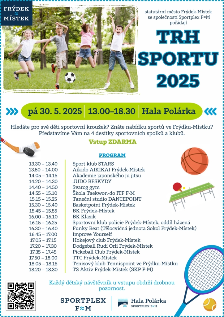 Na čtyři desítky sportovních klubů předvede dětem ve Frýdku-Místku svou činnost. Druhý ročník Trhu sportu, který pořádá frýdecko-místecká radnice, se uskuteční v pátek 30. května od 13 do 18 hodin v hale Polárce. Pro všechny návštěvníky platí vstup ZDARMA.