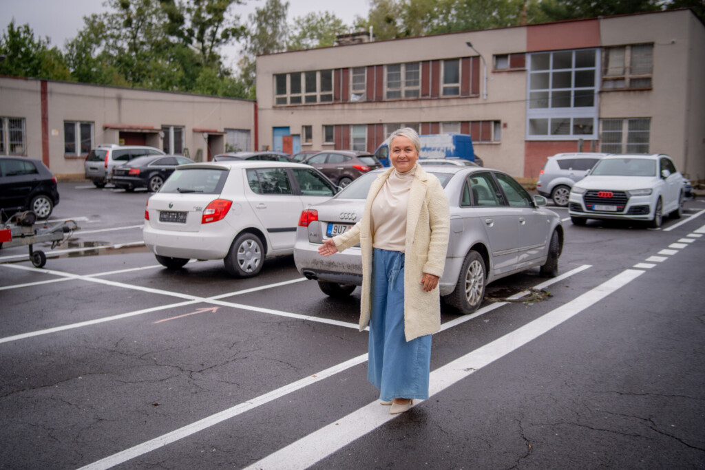 Foto: Náměstkyně primátora Gabriela Rumíšková ukazuje nově vyznačená parkovací místa v areálu bývalých kasáren na ulici Palkovická.