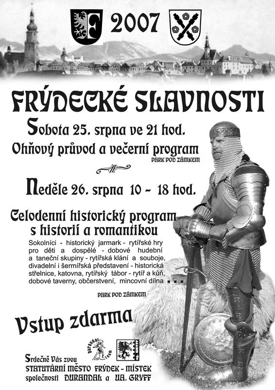 Historické slavnosti budou zahájeny v sobotu 25.srpna v 9 hodin večer na náměstí ve Frýdku, odkud vyjde ohňový průvod směrem do Parku pod zámkem. Tam se také odehraje večerní program, ve kterém nebudou chybět rytíři, šermíři ani divadelníci, kejklíři a tanečníci. Všem přítomným nabídnou ochutnávku z hlavního programu, který se odehraje na druhý den. Neděle tedy bude zasvěcena historickému jarmarku, ale také rytířským a šermířským kláním. Středověkou atmosféru pak jistě navodí dobová hudba, tanečníci, divadelníci a sokolníci. Návštěvníky bude navíc čekat v rytířském táboře spousta her a soutěží, například střelba z kuše nebo luku, chybět nebude ani katovna, dobové taverny nebo mincovní dílna. Všichni jste srdečně zváni. Vstup je zdarma.