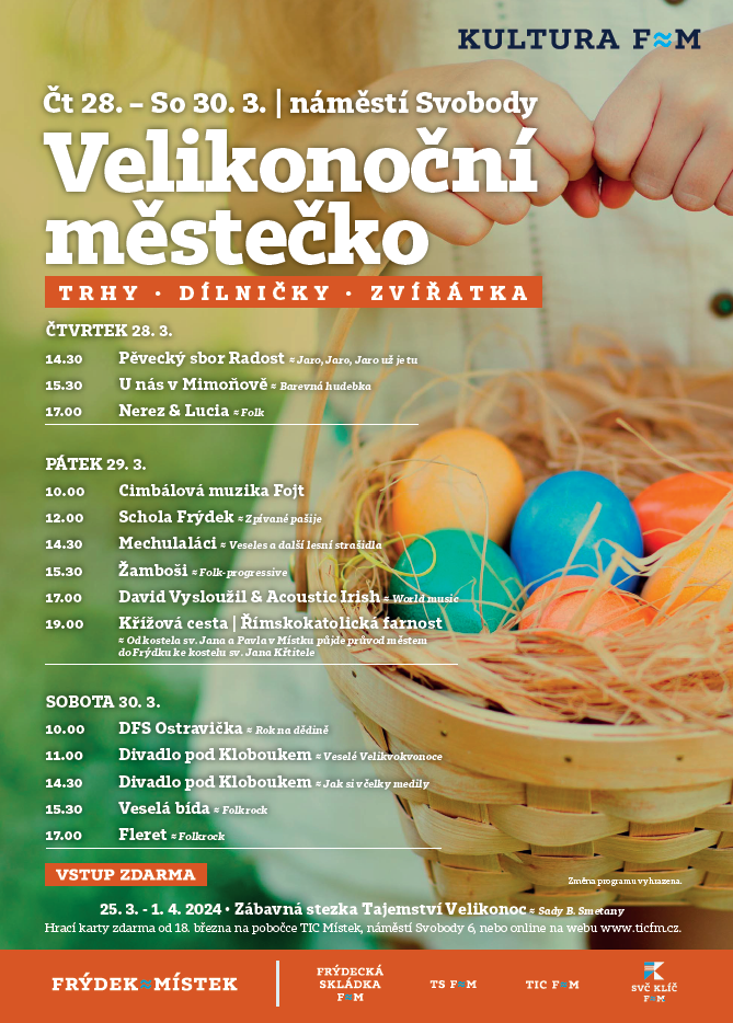 Pro nejmenší účastníky jsou připraveny výtvarné dílničky, divadelní představení, písničkové pásmo, interaktivní a další program. Náměstí opět ožije lidmi, vůněmi, zvuky, zaplní jej trhy s řemeslnými výrobky a nejrůznějšími dobrotami místní gastronomie. „Na své si jistě přijdou nadšenci z řad kutilů a zahrádkářů, kteří zde najdou sortiment nejen rukodělného zboží,“ představuje doprovodný program Linda Hartenbergerová z Kultura F≈M. Na akci je vstup zdarma. Velikonoční městečko pořádá statutární město Frýdek-Místek prostřednictvím Kultura F≈M.