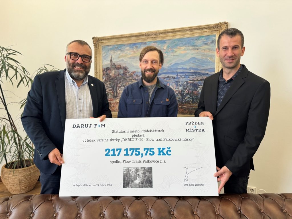 Ve veřejné sbírce Daruj F-M na zřízení flow trailu – stezky pro horská kola v Palkovických hůrkách se podařilo shromáždit 217 175 Kč, z čehož činí dar statutárního města Frýdku-Místku města 90 tisíc korun. Šek s celkovou částkou předali zástupcům spolku Flow Trails Palkovice primátor Petr Korč (Naše Město F-M) a náměstek primátora pro územní plánování a rozvoj, stavebně správní činnosti, ekonomický rozvoj a podnikání, dotace, integrované teritoriální investice, životní prostředí a zemědělství Lukáš Slíva (SPOLU).