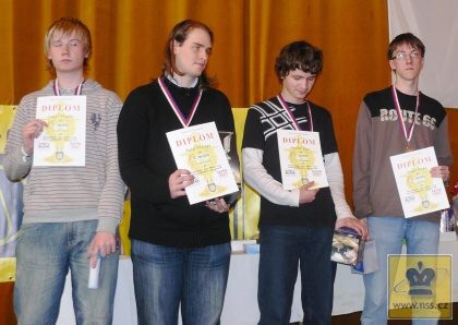 MČR středních škol v šachu Ve Stráži pod Ralskem se ve dnech 21.-22.dubna uskutečnilo „MČR středních škol v šachu“. Frýdek-Místek reprezentovalo čtyřčlenné družstvo Gymnázia Petra Bezruče Frýdek-Místek. Naši gymnazisté v devítikolové turnaji obsadili výborné 2.místo (jen díky horšímu pomocnému hodnocení) a získali po zásluze stříbrné medaile – gratulujeme! Konečné pořadí 1. Gymnázium Česká Třebová 27,0 b./ 190,5 2. Gymnázium P.B. Frýdek-Místek 27,0 b./ 186,0 3. Gymnázium a SOŠ Orlová-Lutyně 23,5 b./ 187,5 4. Gymnázium Plzeň 22,5 b./ 189,5 5. Gymnázium Zlín Lesní čtvrť 21,5 b./ 170,5 6. Gymnázium Kpt. Jaroše Brno 20,0 b./ 181,0 7. OA a HŠ Havlíčkův Brod 19,5 b./ 185,0 8. Gymnázium Jírovcová Č.Budějovice 19,5 b./ 184,0 9. SPŠE Ječná Praha 19,5 b./ 172,5 10. Gymnázium Šumperk 19,5 b./ 161,0 11. Slovanské gymnázium Olomouc 19,5 b./ 145,0 12. Gymnázium Uherské Hradiště 19,0 b./ 190,0 13. Gymnázium Most 19,0 b./ 167,5 14. Gymnázium J.V.J. Č.Budějovice 18,5 b./ 180,0 15. Gymnázium Havlíčkův Brod 18,5 b./ 172,0 16. Gymnázium Český Brod 18,5 b./ 142,5 17. Gymnázium J.Vrchlického Klatovy 18,0 b./ 169,0 18. SPŠSE a VOŠ Liberec 18,0 b./ 154,5 19. Gymnázium J.H. Praha 18,0 b./ 154,0 20. Dvořákovo gymnázium Kralupy 17,5 b./ 171,5 21. Gymnázium Ústí nad Orlicí 17,5 b./ 150,5 22. SPŠ a VOŠ Chomutov 16,5 b./ 165,5 23. Gymnázium Karlovy Vary 16,5 b./ 164,0 24. Gymnázium Česká Lípa 16,0 b./ 130,5 25. SPŠ chemická Brno 16,0 b./ 129,5 26. Gymnázium Vrchlabí 14,5 b./ 134,0 27. Gymnázium a SOŠ Aš 14,0 b./ 134,5 28. Gymnázium Mimoň 13,0 b./ 127,5 29. ŠSK“SPRINT“ při SPŠ Trutnov 12,0 b./ 129,5 Sestava: 1. Rojíček Vojtěch 6,5 b. 2. Pecha Tomáš 7,0 b. 3. Konštacký Matěj 8,0 b. 4. Václavík Aleš 5,5 b. Bližší informace o činnosti BŠŠ naleznete na webových stránkách Beskydské šachové školy – www.chessfm.cz . Foto č.1 – stříbrný tým (zleva Konštacký, Pecha, Rojíček, Václavík) Foto č.2 – Pecha T. nejlepší hráč MČR na 3.šachovnici (vpravo)