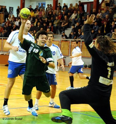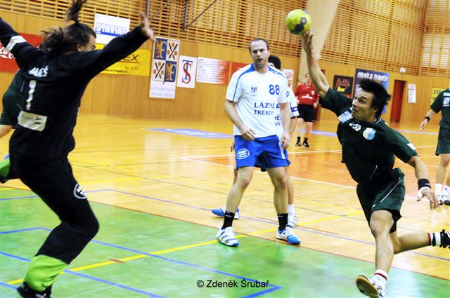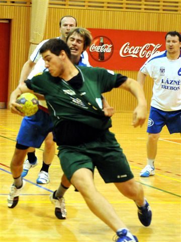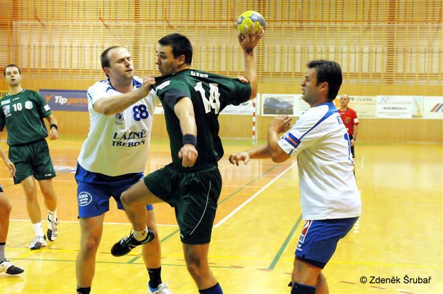 Rozhodčí: Novotný – Samek. vyloučení: 5:5, ČK: Masák, Kotlaba (oba Třeboň), sedmičky:7/6:4/3,diváci:406. Průběh utkání: 3:1, 6:3, 8:7, 10:7, 12:8, 14:11, 16:13, 17:15, 22:18, 24:19, 26:20, 28:22