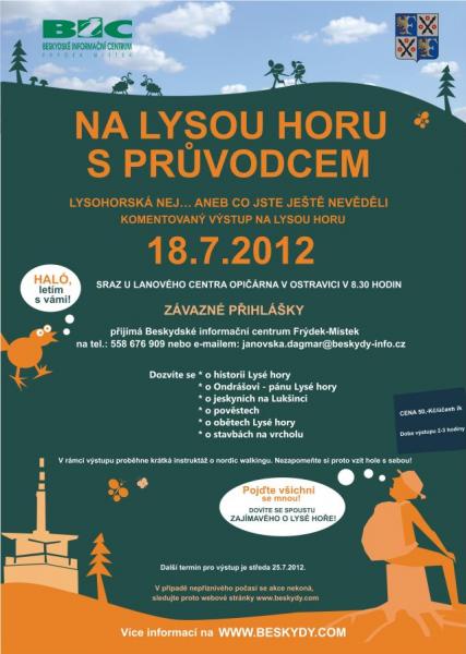 Zájemci o tento termín se mohou hlásit do úterý 17. července 2012, 12.00 hodin na tel. čísle 558 676 909 nebo na e-mailu janovska.dagmar@beskydy-info.cz. Akce se koná pouze v případě příznivého počasí, sledujte proto webové stránky www.beskydy.com! Další termín pro akci Lysohorská nej… aneb co jste ještě nevěděli je opět středa 25.7.2012. Již nyní se můžete hlásit! Nezapomeňte, že počet osob ve skupině je omezen! Srpnové termíny upřesníme v průběhu měsíce července.