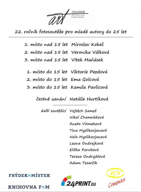 V letošním roce jsme se rozhodli ocenit fotografie ve dvou kategoriích, a to do 15 let a nad 15 let, neboť nás velmi mile překvapila kvalita fotografií dětí do 15 let a chtěli jsme to ocenit.