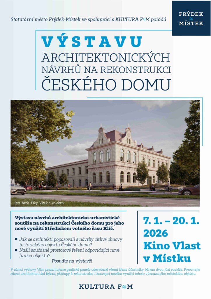 Frýdek-Místek představí veřejnosti návrhy na rekonstrukci Českého domu. Lidé si budou moci prohlédnout nejen vítězný návrh architektonicko-urbanistické soutěže v podání architekta Filipa Vítka a kolektivu z Brna. Město odprezentuje také vizualizace dalších studií, která se klání zúčastnila. Výstava se uskuteční v kině Vlast na Hlavní třídě v Místku od 7. do 20. ledna 2026.