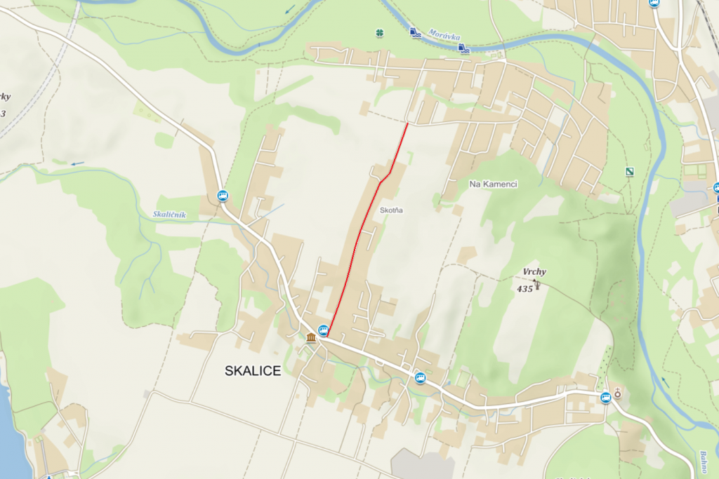 Úzká silnice v prudkém kopci lemovaná domy. To je oblast Skotňa ve Skalici. Navíc jde o důležitou spojnici mezi skalickými částmi Kamenec (směrem na Dobrou) a druhou částí Skalice ve směru na Bašku.