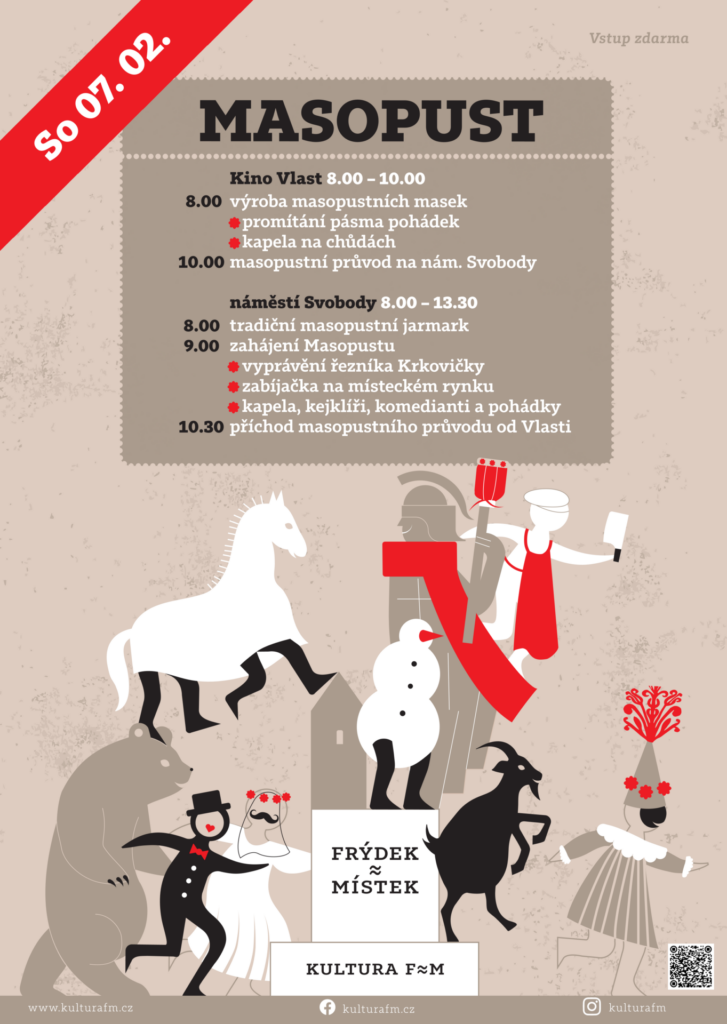 „Letos poprvé se uskuteční oslavy masopustu nejen na místeckém náměstí, ale také v Kině Vlast, které si od osmi do deseti hodin připravilo vlastní program. V deset pak vyjde od něj směrem na náměstí Svobody průvod masek,“ řekl náměstek primátora pro životní prostředí a zemědělství, územní plánování a rozvoj, stavebně správní činnosti, ekonomický rozvoj a podnikání a dotace a integrované teritoriální investice Lukáš Slíva (SPOLU).