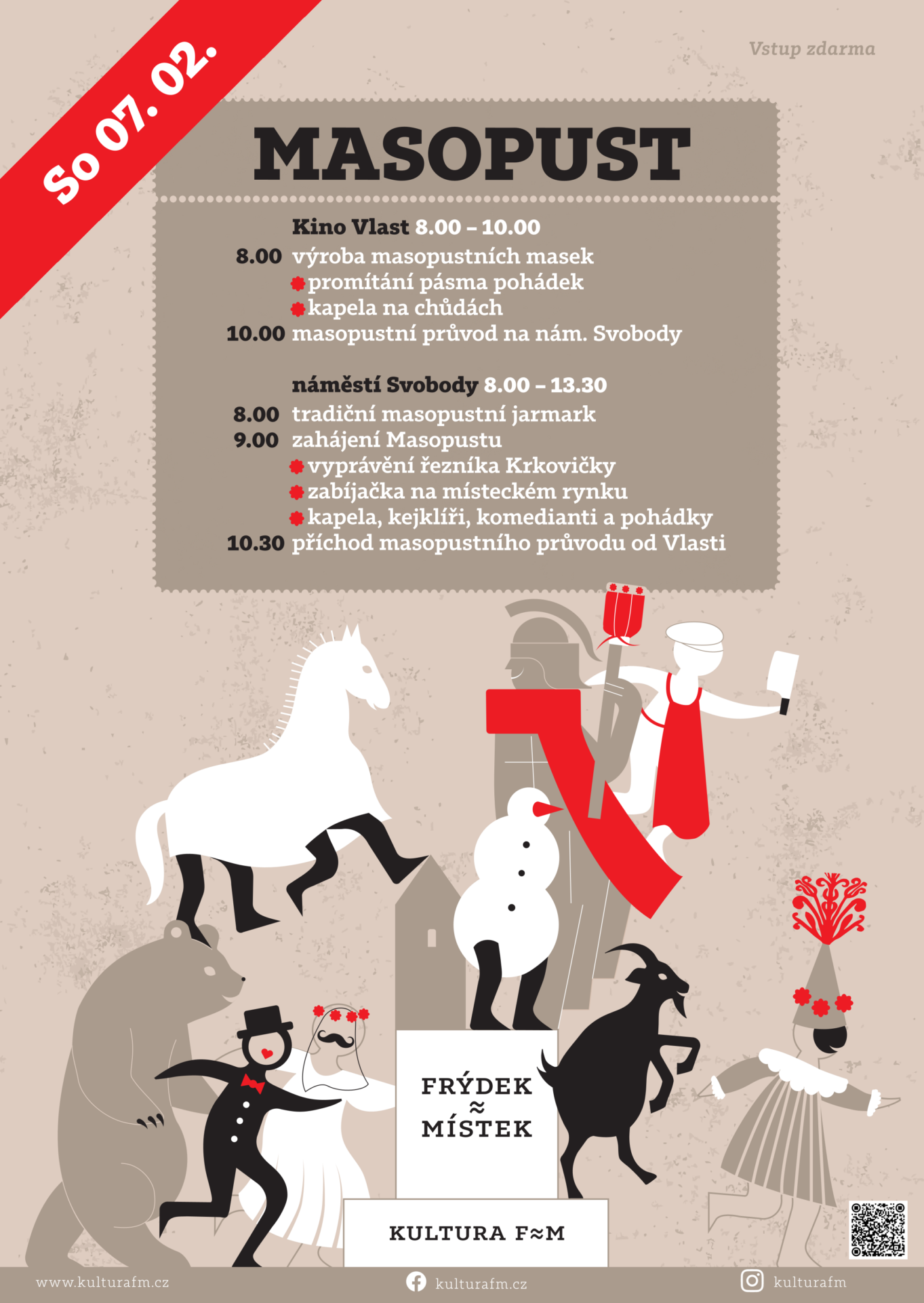 Místecké náměstí Svobody opět ožije v sobotu 7. února tradičním masopustem. V osm hodin ráno zde začne masopustní jarmark, který bude současně předzvěstí blížících se farmářských trhů. Letošní novinkou je zapojení Kina Vlast, které dopoledne nabídne vlastní program.
