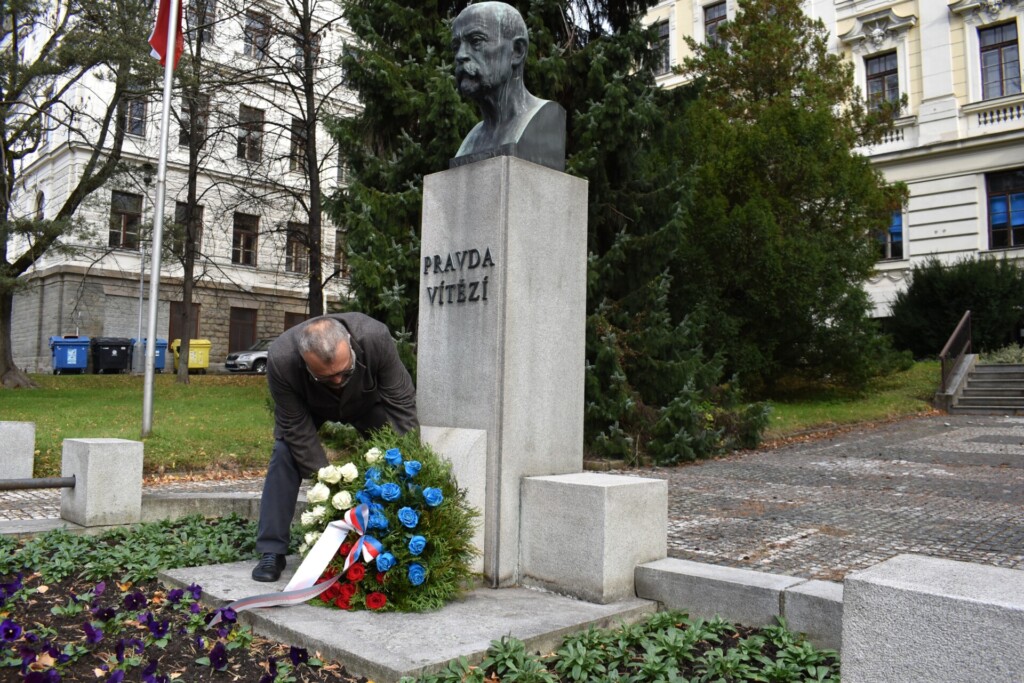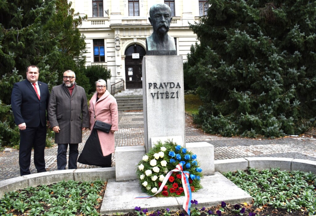 Primátor Petr Korč (Naše Město F-M) a náměstci Lukáš Kmec (ANO 2011) a Gabriela Rumíšková (Naše Město F-M) uctili 107. výročí vzniku samostatného Československa položením věnce k pomníku prvního prezidenta republiky Tomáše Garrigue Masaryka.