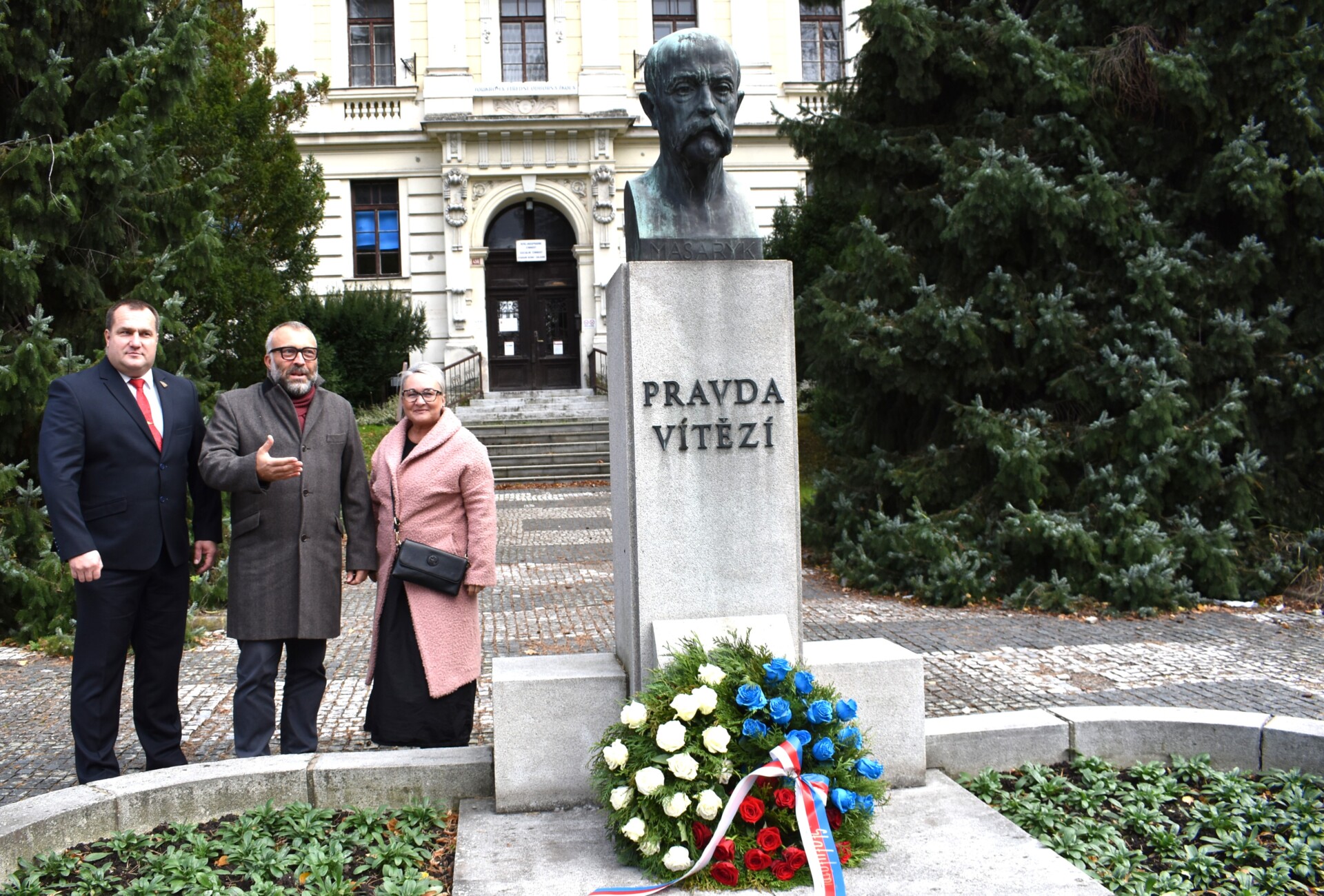 Primátor Petr Korč (Naše Město F-M) a náměstci Lukáš Kmec (ANO 2011) a Gabriela Rumíšková (Naše Město F-M) uctili 107. výročí vzniku samostatného Československa položením věnce k pomníku prvního prezidenta republiky Tomáše Garrigue Masaryka.