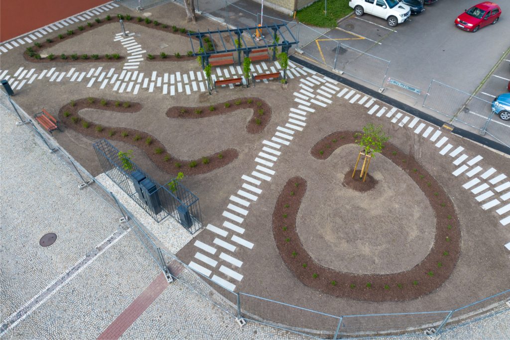 „Plocha byla komplexně upravena podle návrhu architekta Ondřeje Zdvomky. Technické služby odstranily původní betonové plochy po dřívějších budkách a plochu rozdělily na tři části propojené chodníky z nášlapných betonových dlaždic. V jedné části roste okrasná jabloň, která poskytne stín, v další je umístěno mlžítko s pítkem k osvěžení. Prvky, stejně jako samotné místo k proměně, navrhovali občané na plánovacím dni a v online dotaznících,“ upřesnila hlavní architektka města Lucie Šidlová.