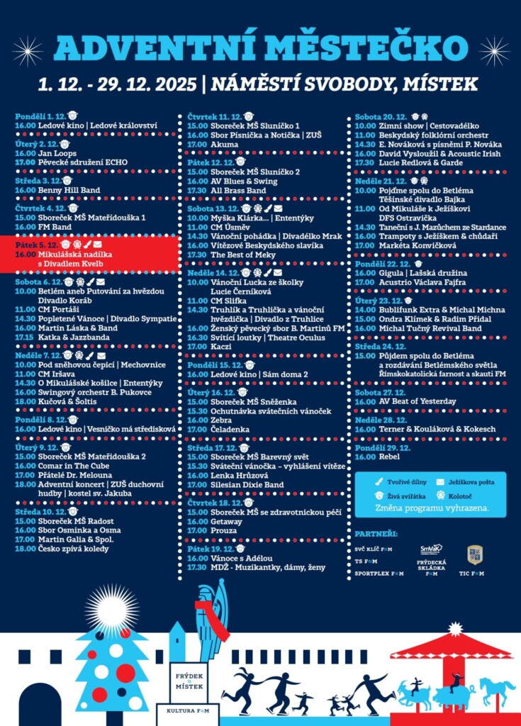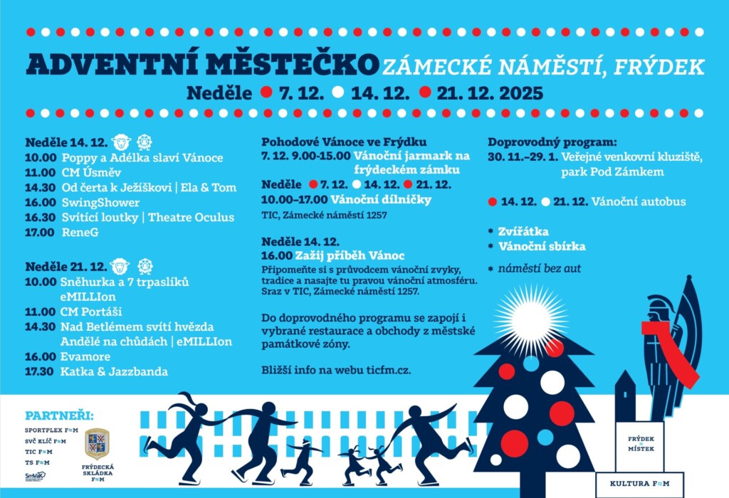 Podrobný program Adventního městečka, vánočních akcí Kultura F≈M a dalších subjektů z Frýdku-Místku a okolí najdete v kalendáři na www.kulturafm.cz a na oficiálních sociálních sítích.