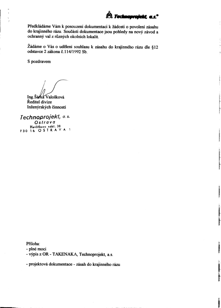 Žádost společnosti Technoprojekt, a. s., se sídlem Havlíčkovo nábř. 38, 730 16 Ostrava, o povolení zásahu do krajinného rázu dle ust. § 12 odst. 2 zákona č. 114/1992 Sb., o ochraně přírody a krajiny, ve znění pozdějších předpisů – výstavba automobilového závodu a ochranného valu v průmyslové zóně Nošovice.